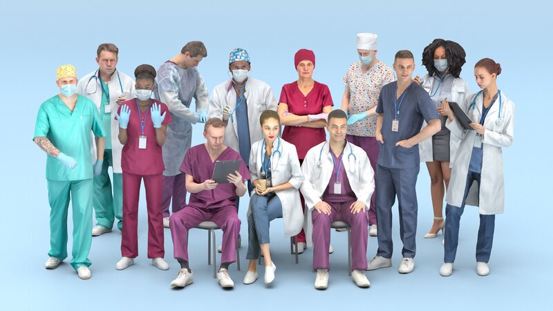 In this bundle, you will find a diverse range of true-to-life human-sized models in a medical style. It includes confident men and attractive women dressed in medical/surgical attire. These models are captured in casual poses, making them a perfect fit for various medical visualizations, such as hospital scenes, surgical simulations, medical training materials, healthcare advertisements, and virtual reality medical applications. They can also be used in medical education materials, medical device presentations, medical research visualizations, and other medical-related projects where realistic human models are needed.
